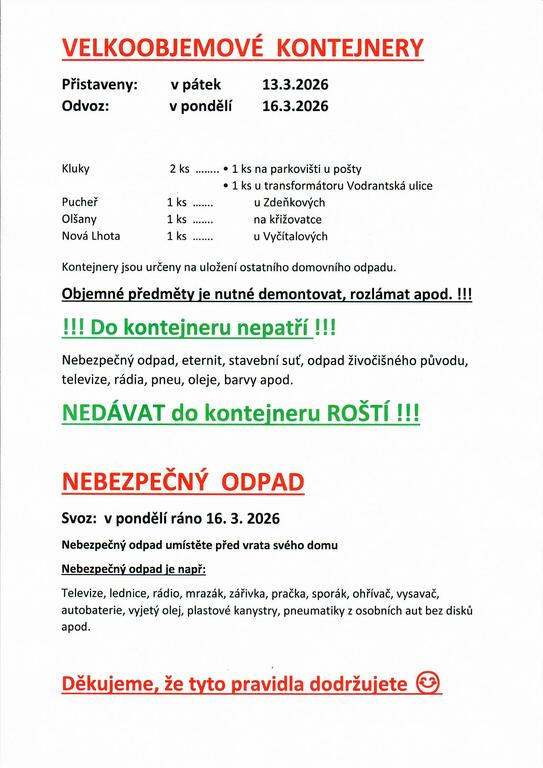 Velkoobjemové kontejnery budou přistaveny v pátek 13.3. Objemné předměty nutné demontovat, rozlámat apod. !!! Svoz nebezpečného odpadu proběhne v pondělí 16.3.