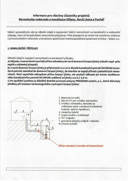 Novostavba vodovodu a kanalizace Olšany, Nová Lhota Pucheř. Od 13.11.2025 je možné zahájit napojování jednotlivých nemovitostí na veřejný vodovod a kanalizaci. Vodoměry se začnou montovat od 24.11.