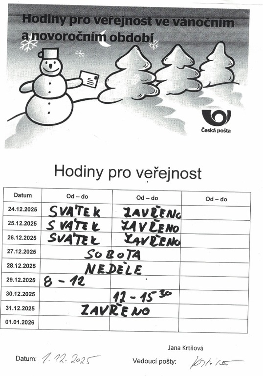 Pošta Partner - otevírací doba o vánočních svátcích. 23.12.2025 otevřeno od 12:00 do 15:30 hod.