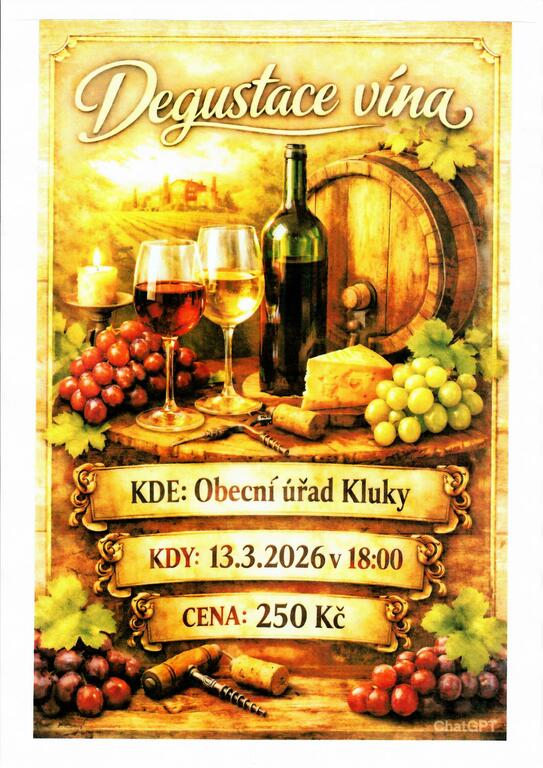 Srdečně zveme všechny občany na degustaci vína, Vinařství Buriánkovi, která proběhne v pátek 13.3 od 18 hod. na OÚ na Klukách. Cena je 250,- Kč Zájemci hlaste se u Katky Kraftové tel. 739 173 533.